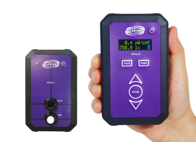 Apollo 3.0 is traceable to NIST (USA’s National Institute of Standards and Technology) and complies with ISO 3059. For the Apollo Blue, the UV-A sensor is replaced by a blue light sensor which is in compliance with CEN/TR 16638. Any Apollo meter can be upgraded to measure luminance by purchasing an upgrade package, including calibration at Labino.